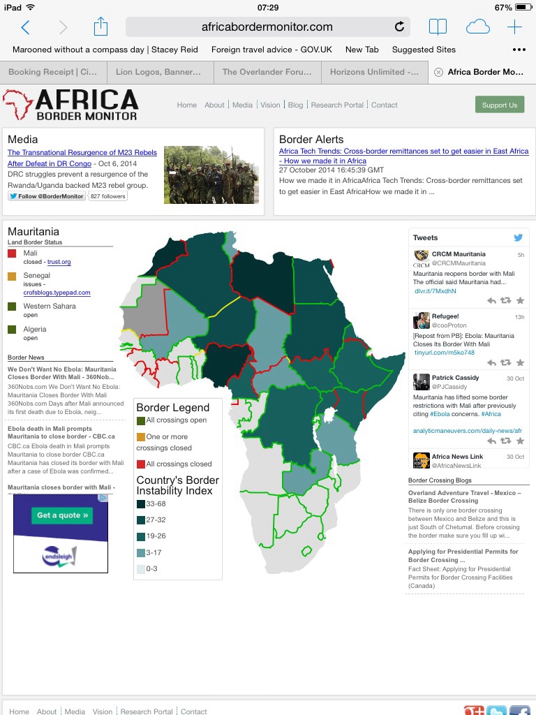 Well it’s changing at a rapid rate of knots, and can change without hardly any notice. Take proposed border crossings as an example. This week, Mauritania closed it’s border with the troubled country of Mali, due to a 2 year old girl from neighbouring Guinea contracting Ebola, and sadly later dying. At the time of writing no other cases have been reported from Mali.